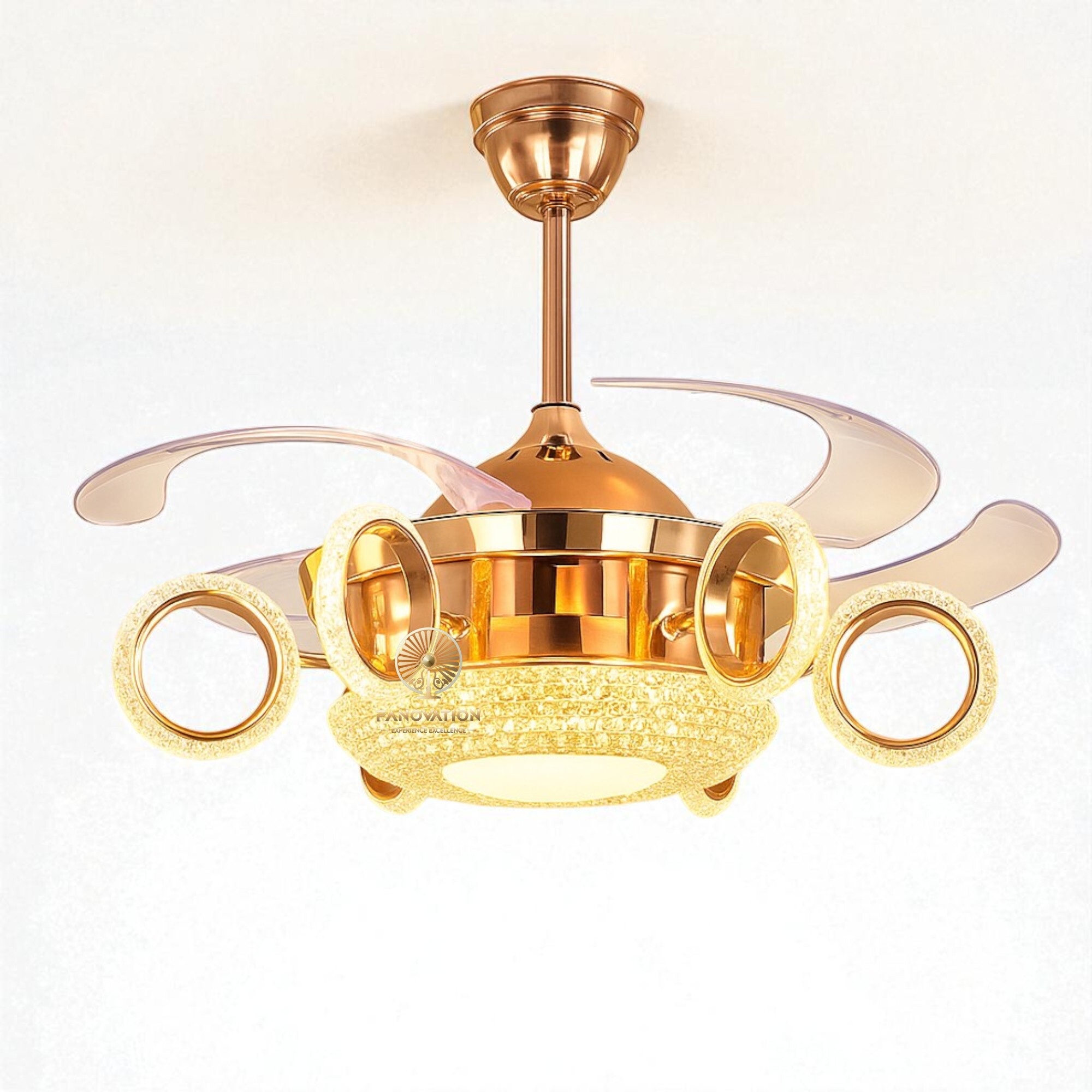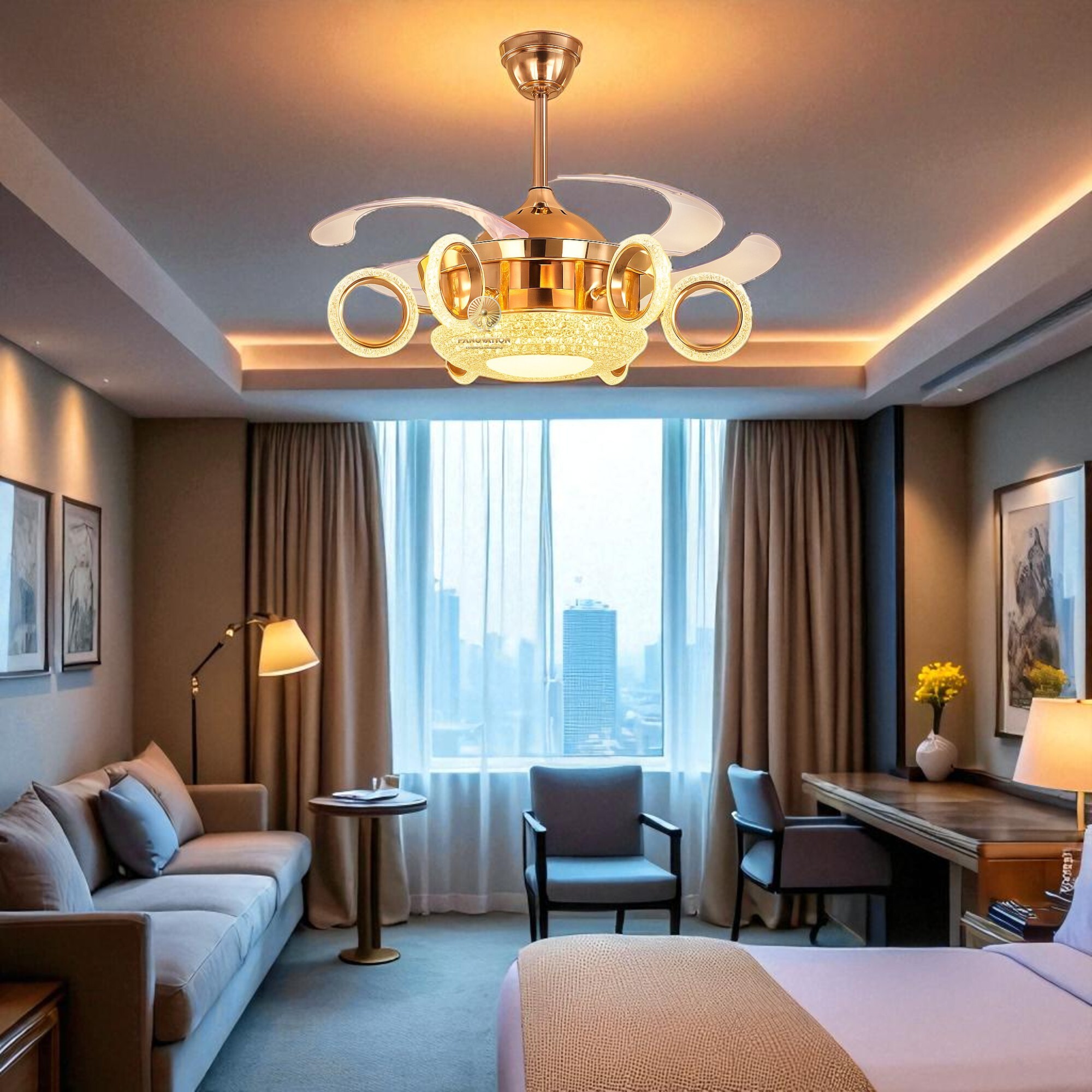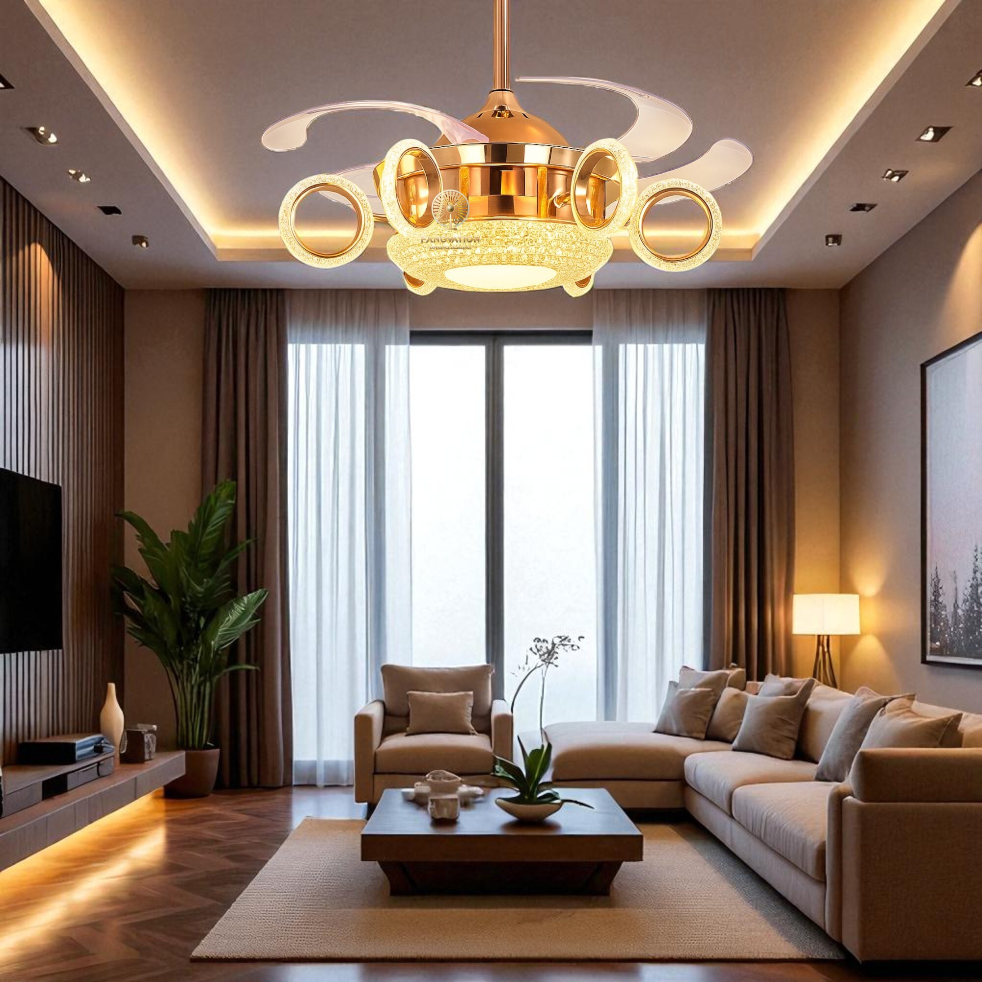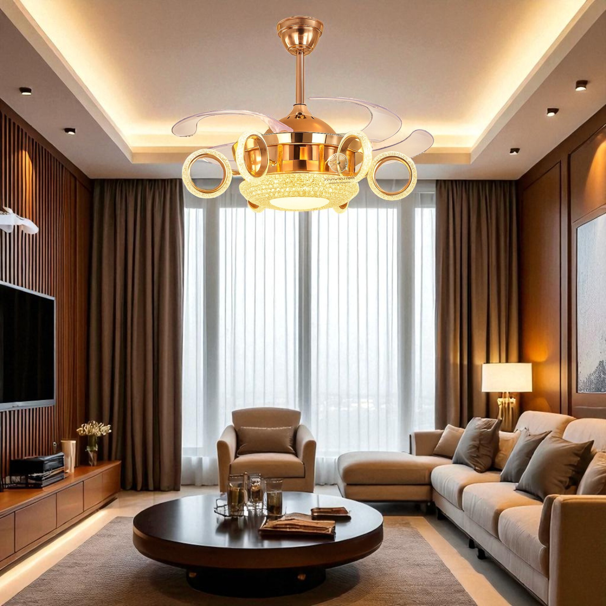 Elevate your living space with the Luxury French Golden 6 Round Acrylic Ceiling Fan Chandelier. This stunning retractable fan lighting fixture features a sophisticated design with sparkling crystal accents, adding a touch of luxury to any room. With three adjustable color lights, it seamlessly adapts to your desired ambiance. Ideal for living rooms, bedrooms, dining areas, entrances, showrooms, and cafés, this versatile chandelier combines style and functionality. The retractable blades provide efficient air circulation when extended and a sleek, unobtrusive look when retracted. Enjoy a blend of elegance and practicality with this exquisite ceiling fan chandelier.