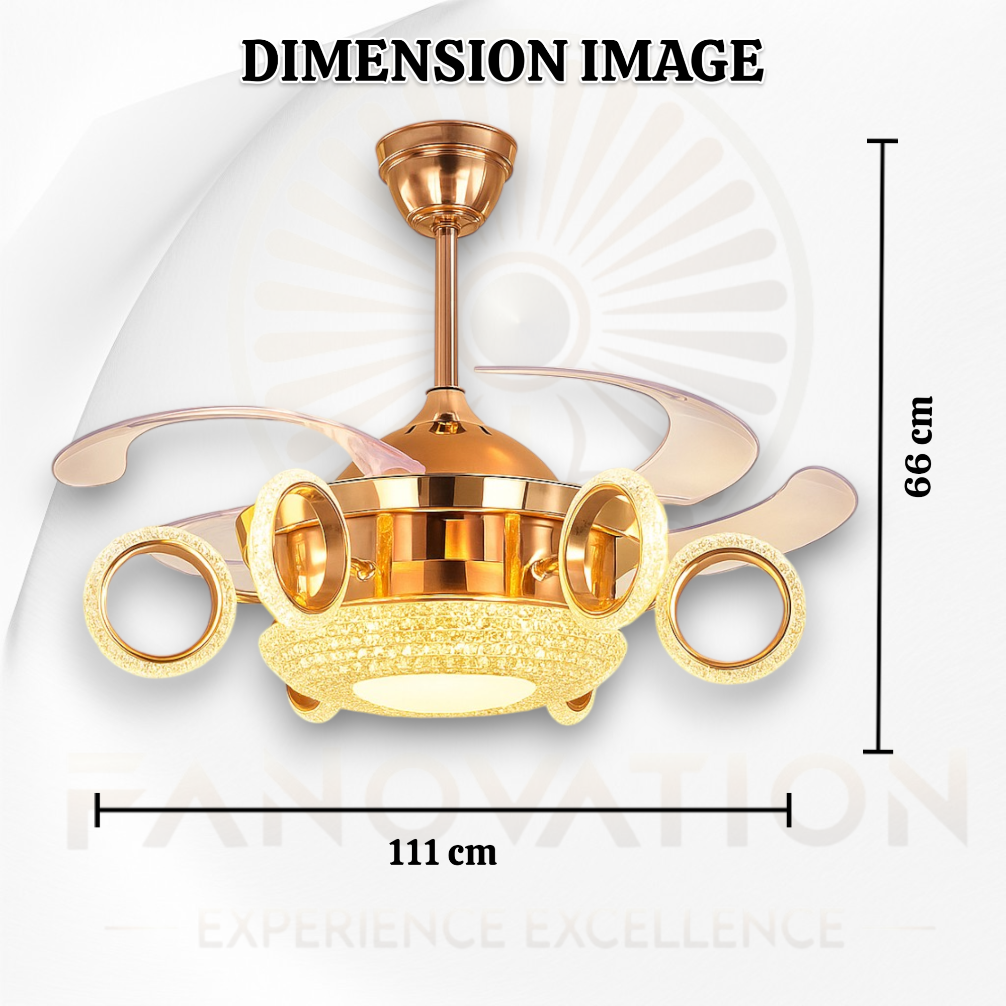- Metal body with 6 acrylic rings shape light attached , crystal Bottom and ABS fan blades with copper binding motor chandelier fan