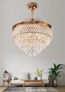 Elevate your living space with the 42-Inch Golden Acrylic Ceiling Fan Chandelier. This stunning retractable fan lighting fixture features a sophisticated design with sparkling accents, adding a touch of luxury to any room. With three adjustable color lights, it seamlessly adapts to your desired ambiance. Ideal for living rooms, bedrooms, dining areas, entrances, showrooms, and cafés, this versatile chandelier combines style and functionality. The retractable blades provide efficient air circulation when extended and a sleek, unobtrusive look when retracted. Enjoy a blend of elegance and practicality with this exquisite ceiling fan chandelier.